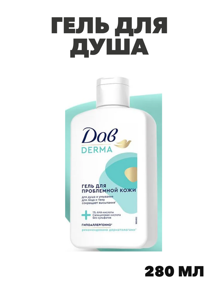 Дав Derma Гель для душа и умывания для лица и тела очищающий, от прыщей гипоаллергенный, 280 мл, n4410-230348